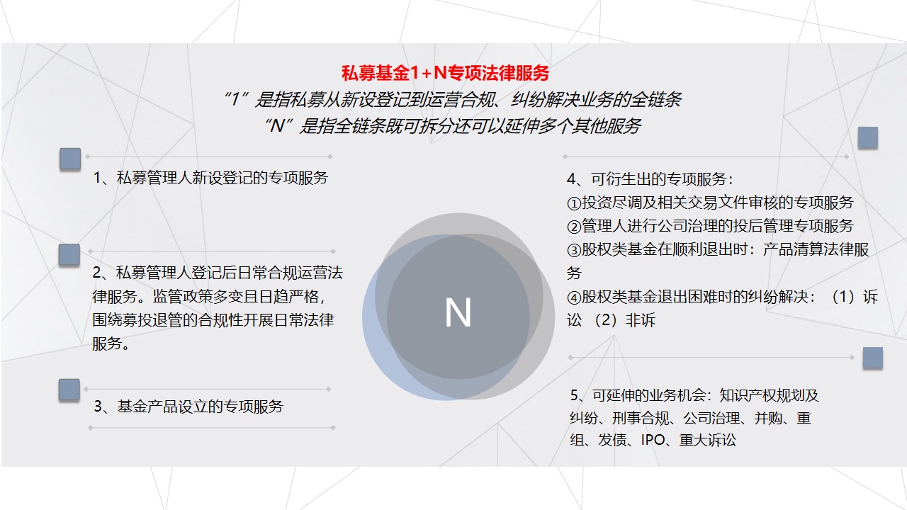 私募基金1+N专项法律服务,“1”是指私募业务从新设登记、运营合规到纠纷解决的全链条,“N”是指全链条既可进行碎片化拆分也可延伸多个其他服务,包括以下服务内容: