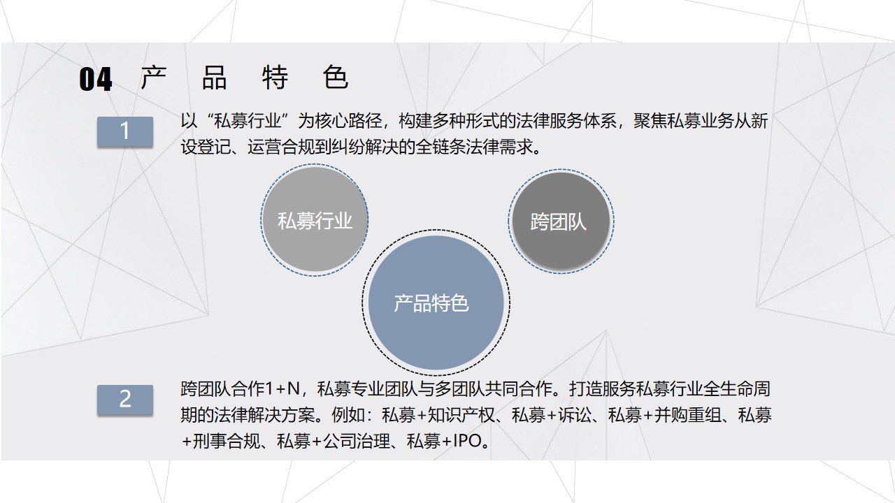 (二)跨团队合作1+N,私募专业团队与多团队共同合作。打造服务私募行业全生命周期的法律解决方案。例如:私募+知识产权、私募+诉讼、私募+并购重组、私募+刑事合规、私募+公司治理、私募+IPO等。