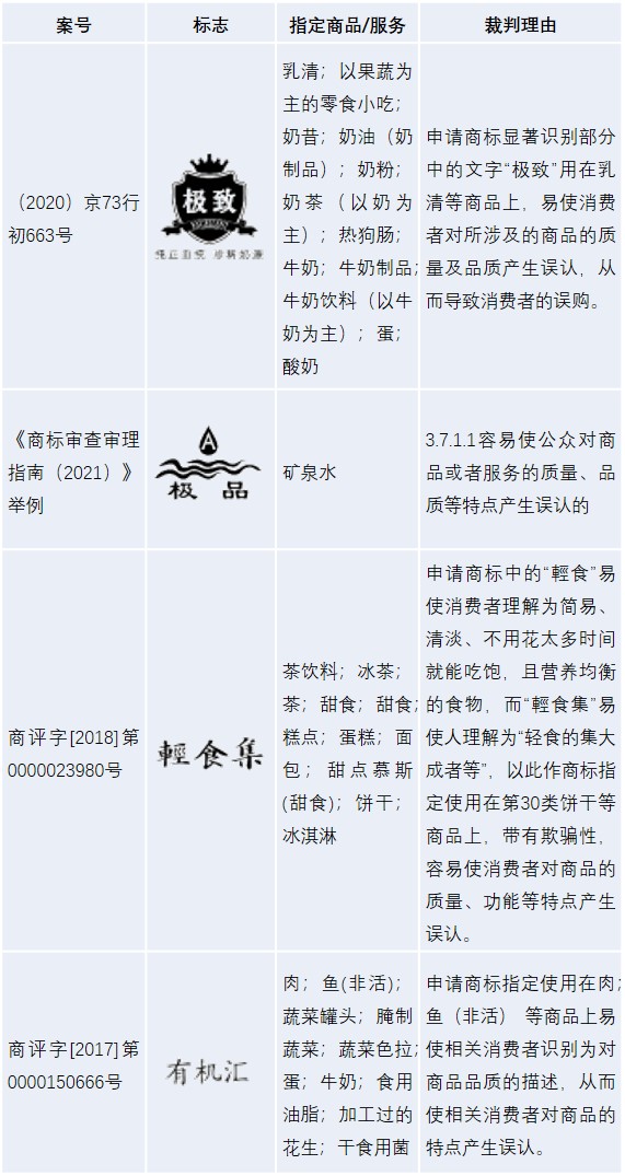 涉案标志的构成元素若包括商品的种类、原材料、成分(例如:化学元素、蛋白质种类等)等,与食品本身的种类、主要原料、成分等不符,并会使相关公众产生错误的认识时,则构成“欺骗性”条款规定的情形。