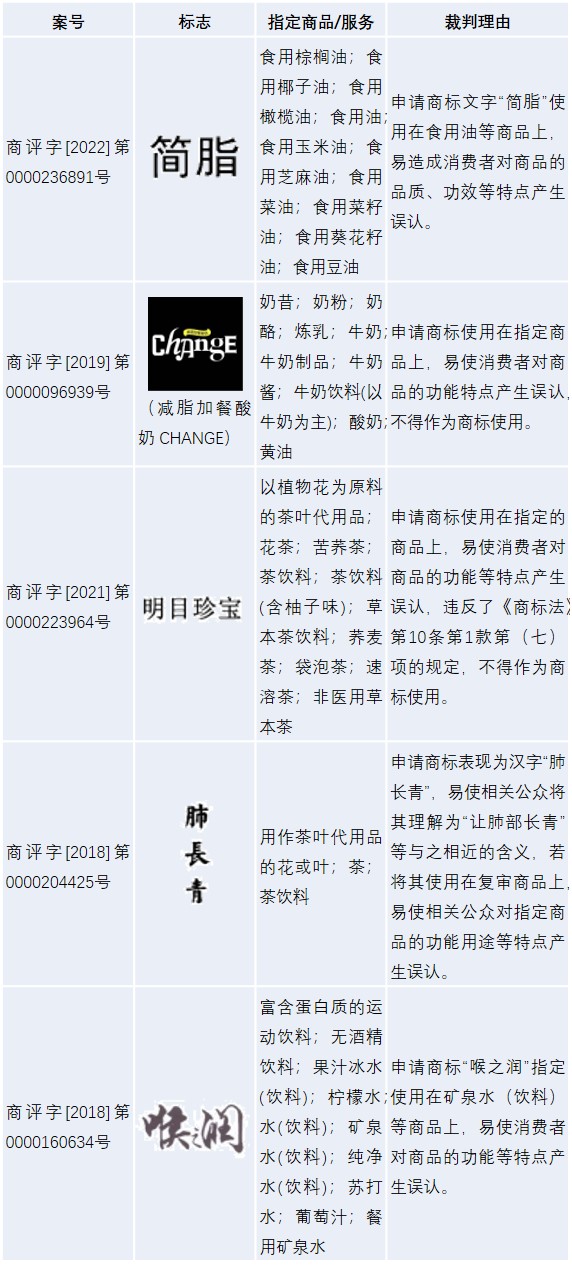 涉案标志构成元素若包含医疗、保健、美容等方面功效的词汇,则具有较高的可能性被认为构成“欺骗性”条款规定的情形。常见情形包括: