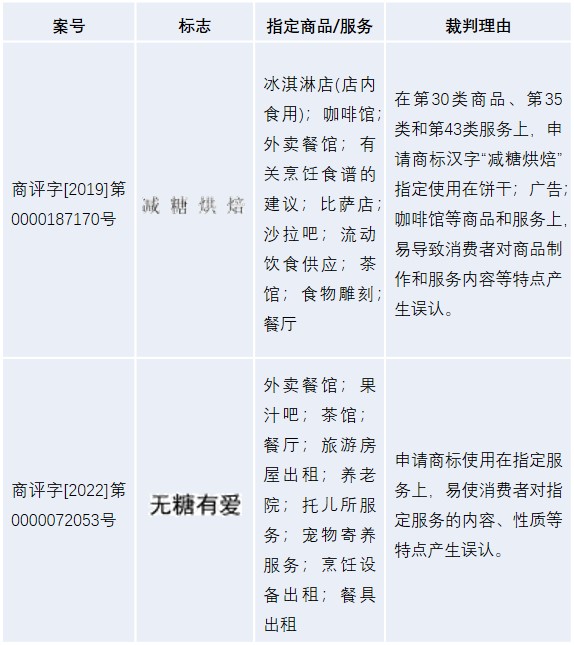 例如,在涉案标志如包含“无糖、减糖、控糖”等词汇,则容易使相关公众(尤其糖尿病患者)对指定的餐饮服务内容产生该餐厅提供的食品系无糖食品或具有控制血糖功效等错误认识。