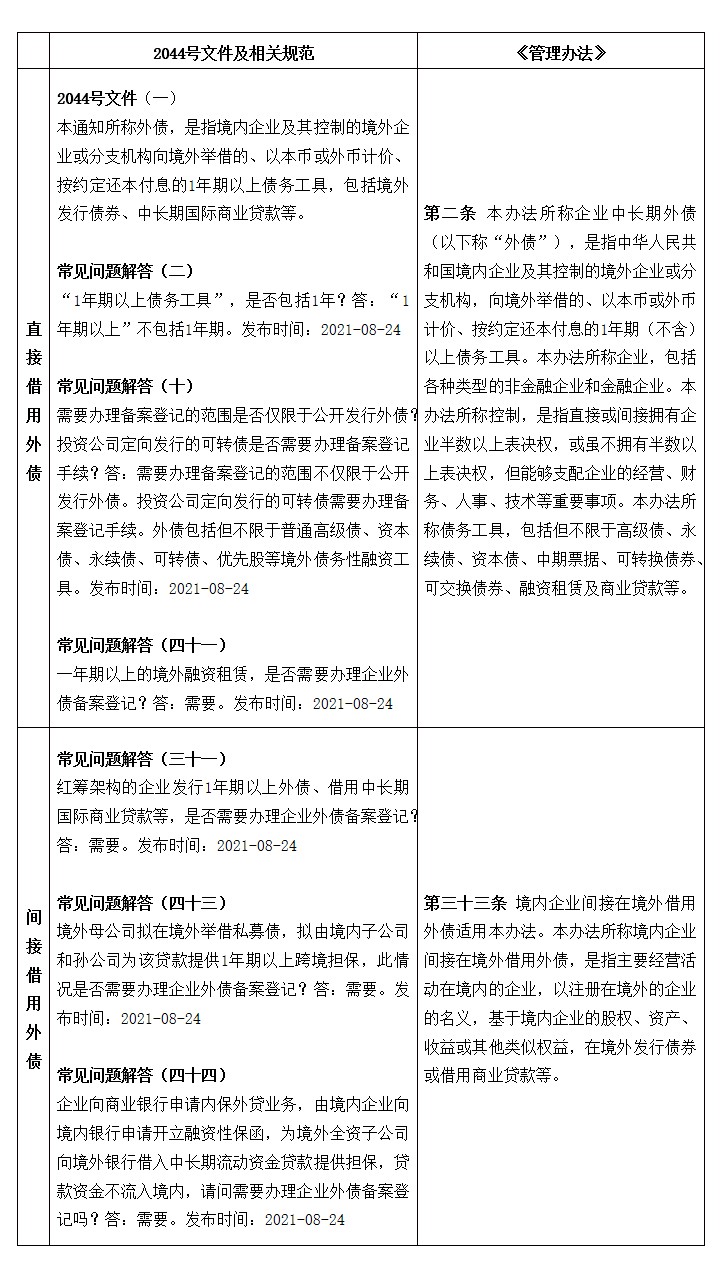 2044号文件只有直接借用外债的规定。国家发改委根据实践需要,通过常见问题解答的方式将红筹架构的企业借用外债、某些内保外贷交易纳入发改委外债管理的范畴之内。《管理办法》在2044号文件及常见问题解答的基础上,将借用外债的情形划分为直接和间接两种,通过定义的方式进行规范。