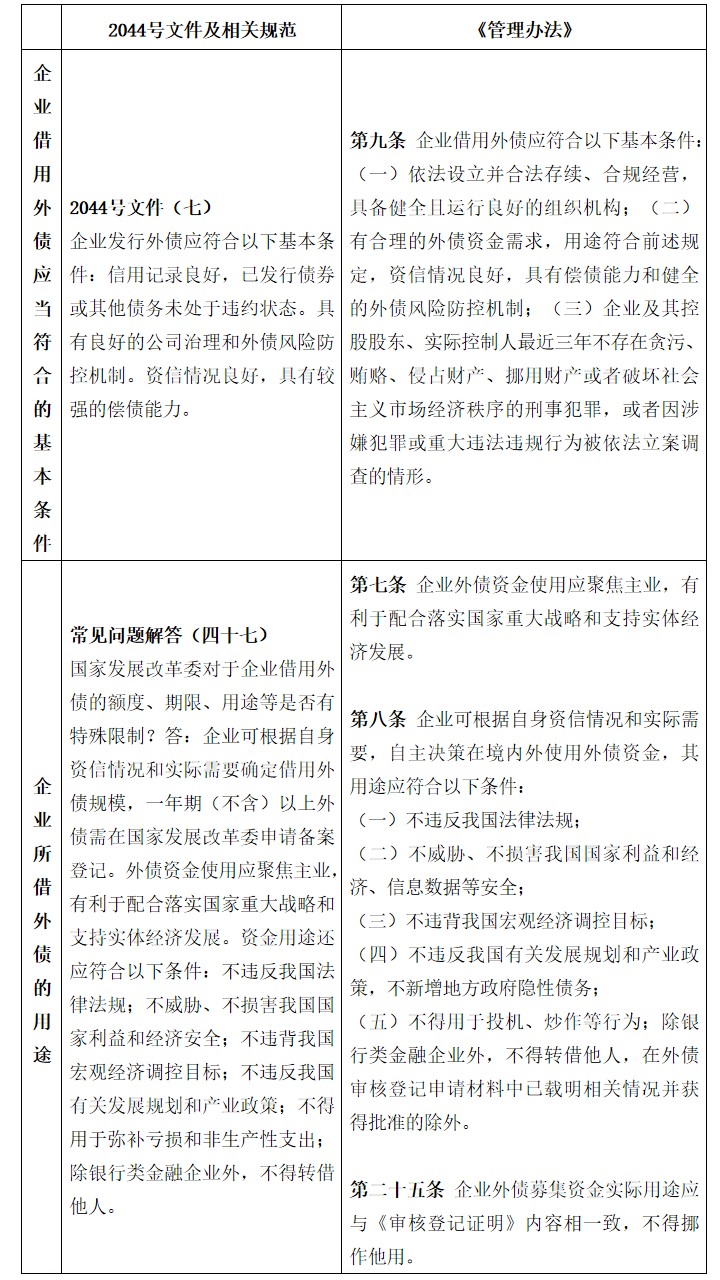 对于企业借用外债应当符合的基本条件,《管理办法》作出以下调整:其一,删除了“已发行债券或其他债务未处于违约状态”,将“具有较强的偿债能力”调整为“具有偿债能力”;其二,强调企业借用外债应当“有合理的外债资金需求”;其三,新增了对企业及其控股股东、实际控制人不存在某些刑事犯罪或者因涉嫌犯罪或重大违法违规行为被依法立案调查的情形。