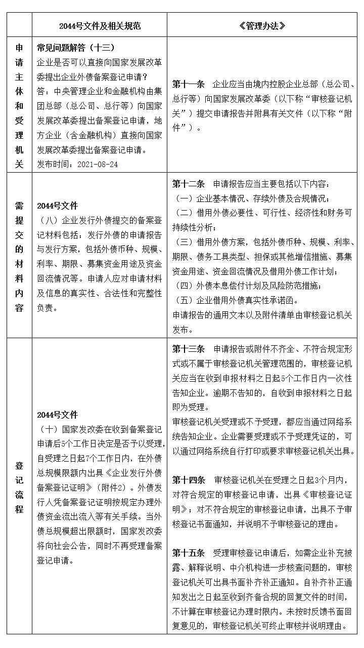 《管理办法》第十九条规定,企业在申请审核登记过程中,因融资计划或方案调整等原因,需要撤回审核登记申请的,应及时向审核登记机关提交撤回申请。而2044号文件没有此类规定,但在实操中可自拟文件提交给国家发改委,文件内容包括企业名称、撤回事项、撤回原因等要素。