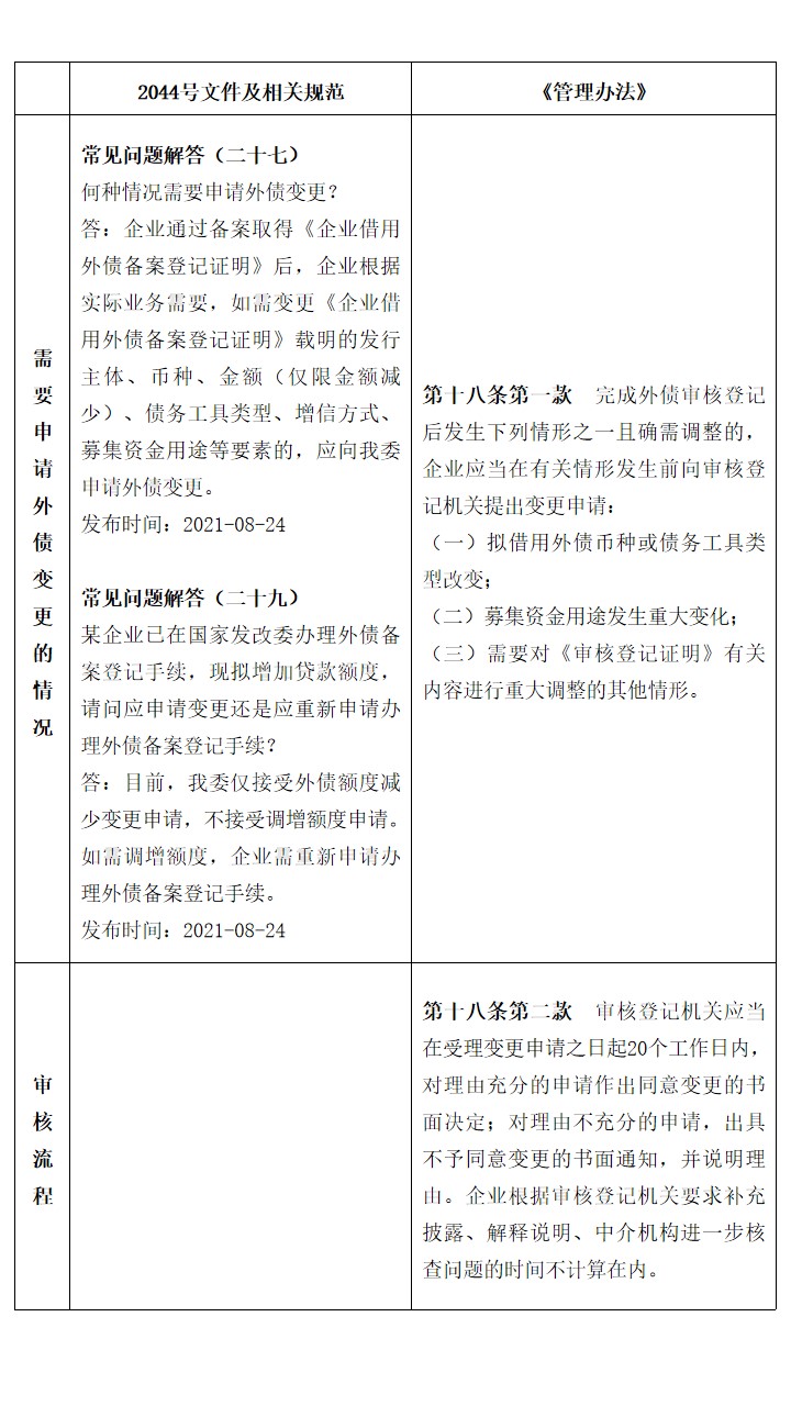 在《管理办法》实施前,有关企业中长期外债审批的文件为2044号文件,该文件性质为“其他规范性文件”,内容仅有十四条,主要在宏观层面上为推进企业借用中长期外债管理由审批制改为备案登记制指明总体方向;部分条文对于企业申报外债、备案登记并没有很强的实践指导作用。2044号文件实施后,国家发改委通过出台办事指引、常见问题解答[4]等对相关规定进行细化。