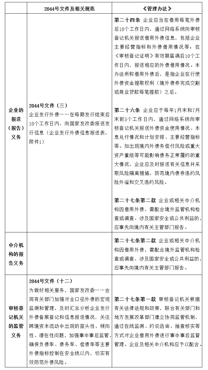 较于2044号文件,《管理办法》关于外债风险管理及事中事后监管的部分规定,新增了企业借用外债后每半年一次的报送义务,报送内容为外债资金使用情况、本息兑付情况和计划安排、主要经营指标等;新增了企业和中介机构配合境外部门调查的事前报告义务。