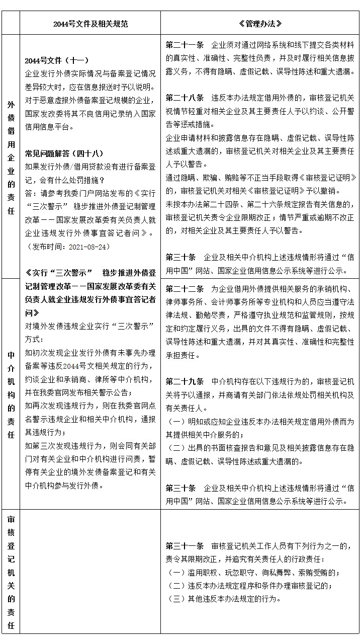 2.从涵盖主体来看,涵盖外债借用企业、中介机构及审核登记机关三方主体,新增了审核登记机关的违规责任,体现了权责统一原则;
