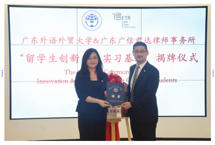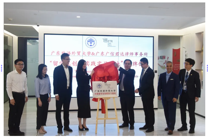 为扩大留学生实习平台,进一步推进校企交流与合作,广东外语外贸大学(简称“广外”)留学生教育学院在广信君达律师事务所设立外国留学生创新实习基地,并于2020年9月25日下午在本所举行签约揭牌仪式暨“国际化人才职业发展经验”交流分享会。广外留学生教育学院院长蔡红、学生事务主任王一仟,广信君达主任王晓华、跨境金融与投资法律研究中心主任闪涛、高级合伙人律师全朝晖、合伙人律师张由及10余位涉外律师代表和来自14个国家的20余位留学生齐聚一堂。活动由本所律师助理曹杨欣柳主持。