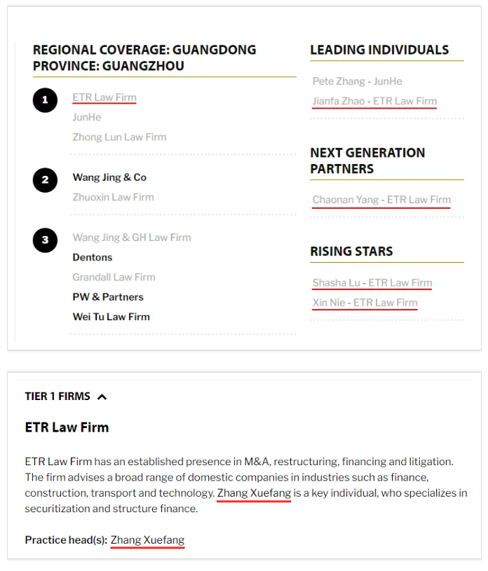 2021年1月13日,国际权威法律评级机构2021 The Legal 500亚太地区中国法域律所榜单发布,广信君达律师事务所凭借出众的专业实力、优质的法律服务及客户口碑再度入选榜单,荣登广东广州值得推荐律所 Tier 1。同时,本所高级合伙人律师赵剑发被评为领先律师,合伙人律师杨超男被评为新星律师,专职律师鲁莎莎、聂昕被评为明日之星。高级合伙人律师张雪芳在证券化与结构融资领域的突出表现获得提名。