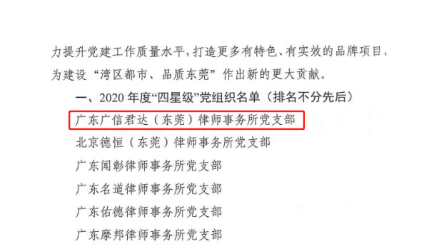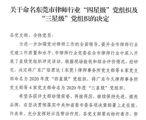 2021年6月2日,东莞市律师行业党委印发了《关于命名东莞市律师行业“四星级”党组织及“三星级”党组织的决定》,包括广东广信君达(东莞)律师事务所党支部在内的6家党组织获评“四星级”党组织称号。
