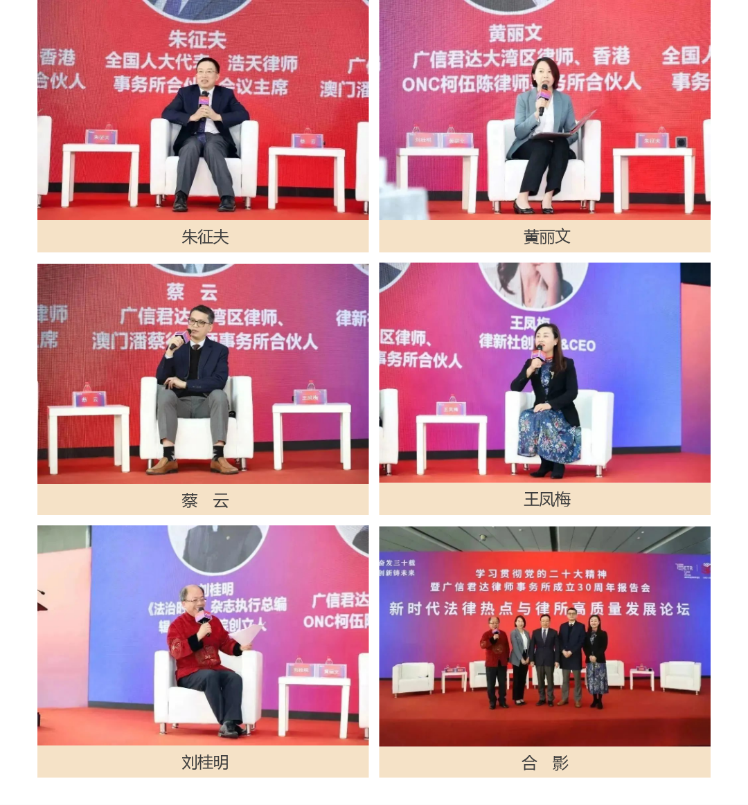 全国人大代表、浩天律师事务所合伙人会议主席朱征夫律师指出,律所的高质量发展要以律师的高质量发展为基础,要注重培养人才,注重承担社会责任;广信君达大湾区律师、香港ONC柯伍陈律师事务所合伙人黄丽文律师,认为律所应注重管理机制的优化,注重律所人才的多样性;广信君达大湾区律师、澳门潘蔡徐律师事务所合伙人蔡云律师,认为律所要注重科技手段协助提升服务质量;律新社创始人王凤梅CEO则分享了她与四十多位大型律所主任访谈“什么是好律所,什么是好律师”的心得体会。