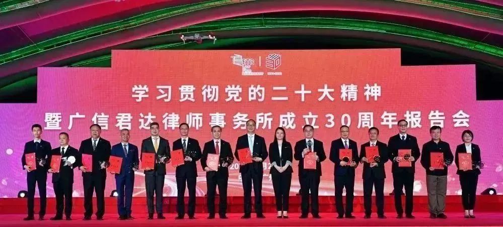 藉广州深化律师制度改革30年之际,为总结经验,谋划未来,笃定高质量发展目标,2023年2月26日,我所在广州塔举办“学习贯彻党的二十大精神暨广信君达律师事务所成立30周年报告会”,专家学者、客户代表、高校校友会领导、律师同仁及我所全体员工等约1200人,欢聚一堂、共襄盛举,逾万人通过线上参与。