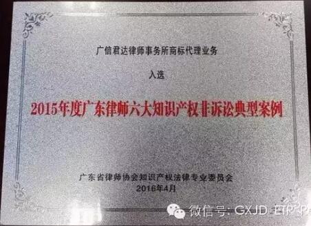 广信君达商标代理业务成功入选“2015年度广东律师六大知识产权非诉讼典型案例”。作为自《律师事务所从事商标代理业务管理办法》实施后第一批备案的律师事务所,广信君达组建专业、优秀的团队,配备完善的系统,开展商标代理业务。我所的商标代理业务在多年的经验累积下,获得较高的行业声誉,并取得较好的代理业绩和效果,此次入选“2015年度广东律师六大知识产权非诉讼典型案例”是对我所商标代理业务的极大肯定!