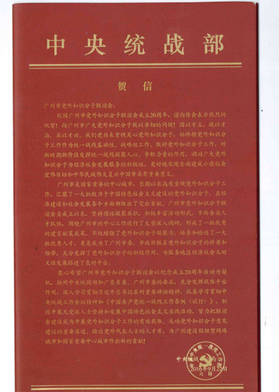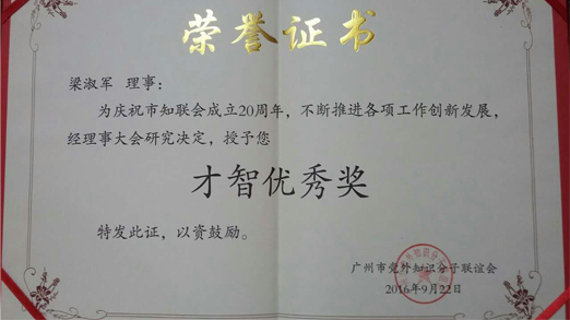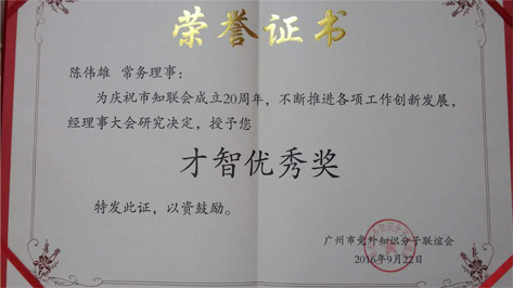 2016年9月22日,广州市党外知识分子联谊会四届三次理事会暨市知联会成立20周年庆祝大会在广州市社会主义学院隆重举行。广东省委统战部副部长陈升东,市委常委、市委统战部部长卢一先,市政协副主席、农工党市委会主委余明永,民建市委会主委姚建明,市各民主党派、工商联负责人,市直各有关部门以及各区委统战部、市属高校党委统战部有关领导,市知联会全体理事以及受邀的社会各界人士出席了本次活动。市知联会四届三次理事会审议通过了《关于表彰市知联会才智贡献奖、才智优秀奖的决定》、《关于成立广州市新的社会阶层人士联谊会律师行业分会、注册会计师行业分会的决定》。广东广信君达律师事务所合伙人陈伟雄律师、梁淑军律师荣获“才智优秀奖”。