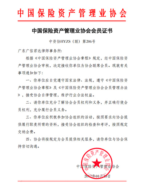 2017年1月20日,经中国保险资产管理业协会(以下简称“协会”,英文名称为:Insurance Asset Management Association of China,缩写为IAMAC)审核,接收广东广信君达律师事务所为协会联席会员。广信君达作为协会联席会员,享有参加协会组织的培训、会议、交流等活动,获得协会提供的数据信息、技术支持、宣传等服务,按照自律管理规定和监管部门委托开展业务创新;对协会工作提出批评、建议和监督,通过协会向有关部门反映意见和建议,通过协会维护其在保险资产管理行业的合法权益等权利。
