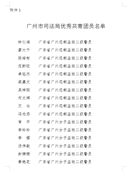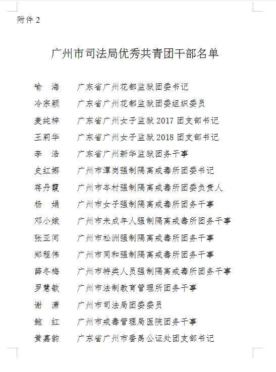 《通报》称,为深入学习贯彻习近平新时代中国特色社会主义思想,学习宣传贯彻党的十九大、十九届二中、三中全会精神,深入推进广州共青团改革,大力推进从严治团,切实增强团员的先进性和光荣感,让团员更像团员,进一步提升团组织的创造力、凝聚力和战斗力,经局党委研究决定,确定了“广州市司法局优秀共青团员”、“广州市司法局优秀共青团干部”。希望先进个人珍惜荣誉,再接再厉,拼搏进取,发挥先锋模范作用,在今后工作中再立新功、再创佳绩。
