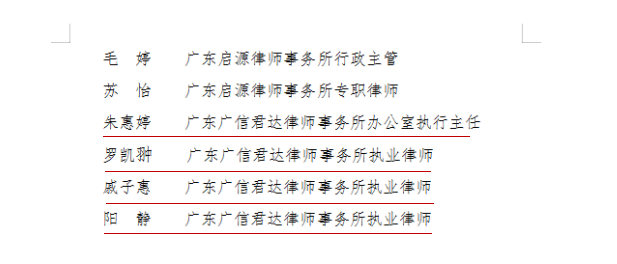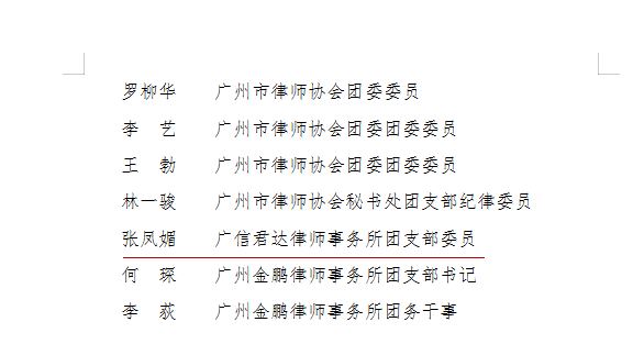 近日,共青团广州市司法局委员会印发了《关于2018-2019年度广州市司法局优秀共青团员、优秀共青团干部的通报》(穗司团〔2019〕6号)(以下简称《通报》)。广东广信君达律师事务所团员律师罗凯翀、戚子慧、阳静,办公室执行主任朱惠婷获“广州市司法局优秀共青团员”,团支部委员张凤媚律师获“广州市司法局优秀共青团干部”。