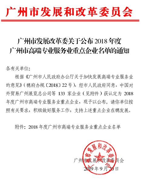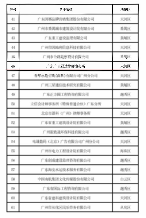 近日,根据《广州市人民政府办公厅关于加快发展高端专业服务业的意见》(穗府办规〔2018〕22号),通过组织申报、初审、复审、公示等程序,经市人民政府同意,广州市发展改革委员会公布了2018年度广州市高端专业服务业重点企业名单,广东广信君达律师事务所成功入选。